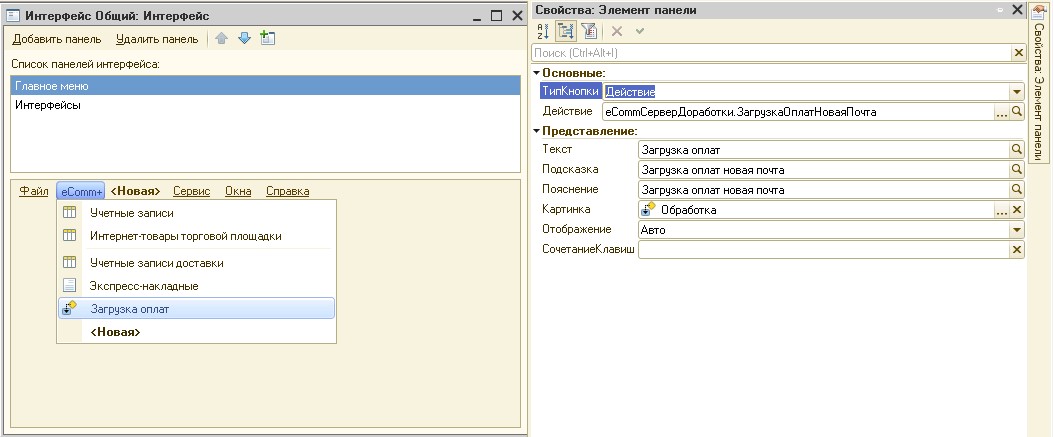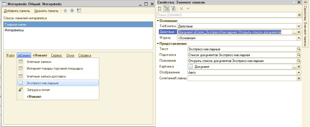 Добавим в интерфейс «Полный» (или какой-либо другой требуемый интерфейс) подменю «eComm» с пунктами: «Учетные записи доставки», «Экспресс-накладные» и «Загрузка оплат»