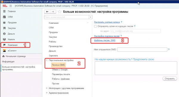 Компания ⇒ Администрирование ⇒ Почта, SMS, напоминания