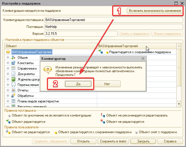 Если конфигурация ранее дорабатывалась то сразу переходите к добавлению справочника “ХарактеристикиНоменклатурыПрисоединенныеФайлы”, так как возможность редактирования уже включена