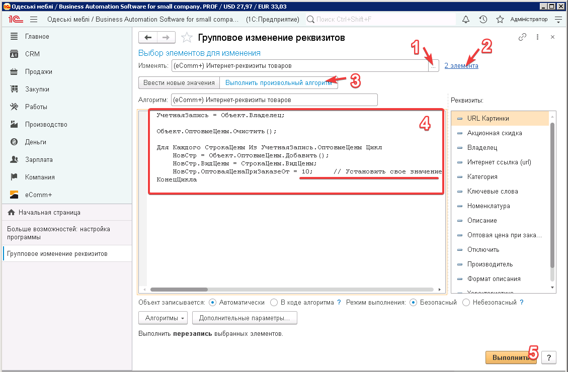 Компания ⇒ Администрирование ⇒ Корректировка данных ⇒ Групповое редактирование реквизитов