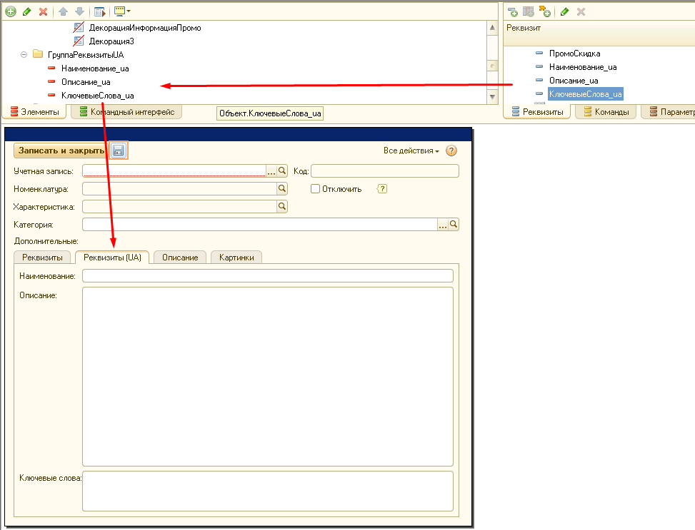 2. Отобразить реквизиты наименования, описания, ключевых слов на форме.