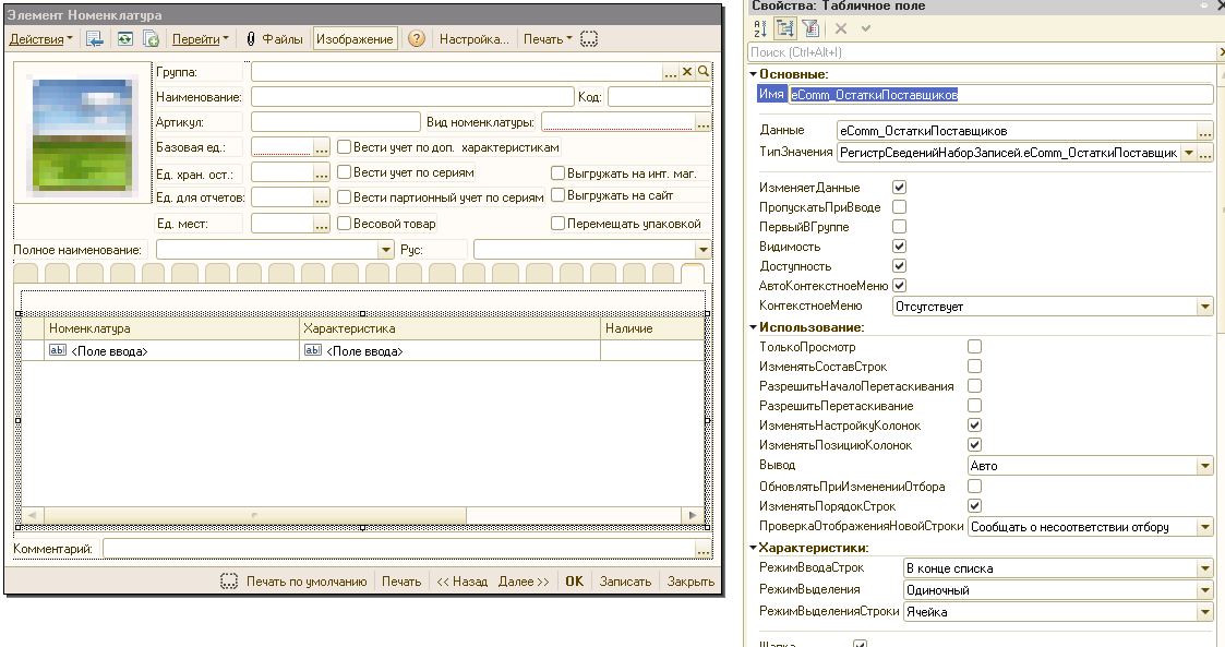 Добавим реквизиты и элементы на форму: Добавим вкладку «ОстаткиПоставщиков». На вкладку «ОстаткиПоставщиков» добавим табличное поле «eComm_ОстаткиПоставщиков»