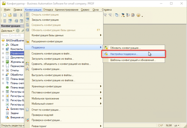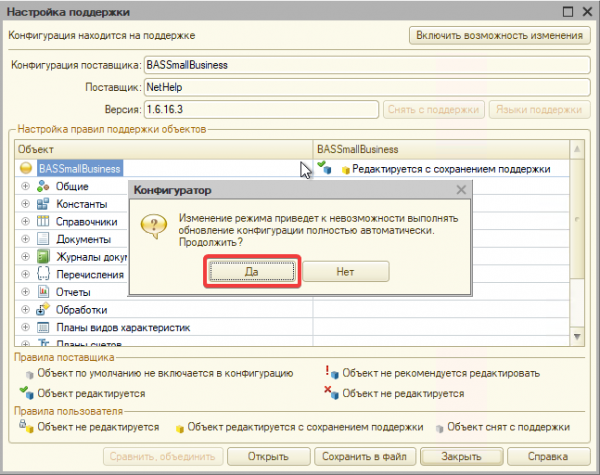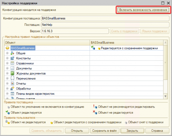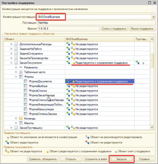 В случае недоступности редактирования делаем доступными для редактирования объект документа «Заказ покупателя» и форму документа «Заказ покупателя» (Конфигурация ⇒ Поддержка ⇒ Настройка поддержки):