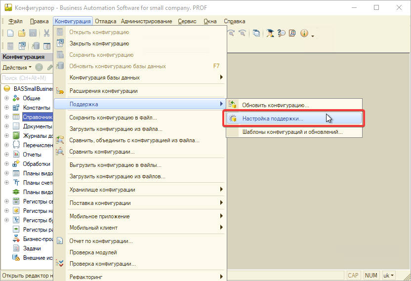 Если конфигурация ранее дорабатывалась то сразу переходите к объединению подсистемы с конфигурацией, так как возможность редактирования уже включена