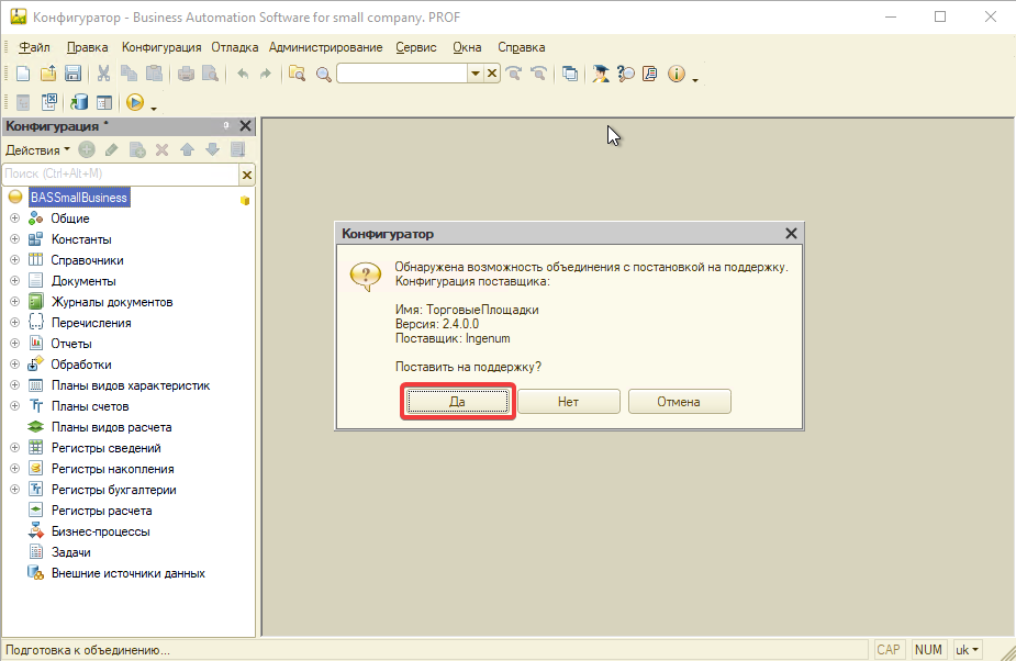 Нажимаем «Обновить конфигурацию баз данных» и соглашаемся на реструктуризацию: