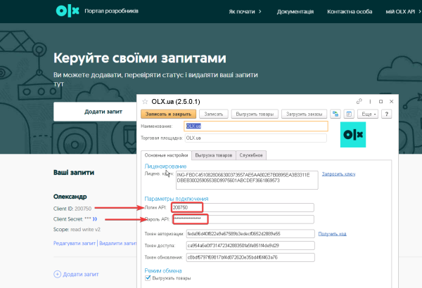 После авторизации создадим запрос на использование API. «Client ID» и «Client Secret» внесем соответственно в поля «Логин API» и «Пароль API» в настройках учетной записи Olx учетной системы
